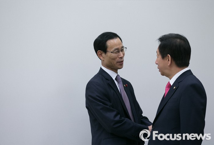 (서울=포커스뉴스) 28일 오전 서울 여의도 국회에서 열린 중고자동차 시장 선진화 관련 당정협의에 참석한 최정호(왼쪽) 국토교통부 2차관과 김성태 새누리당 예결정조위원장이 대화하고 있다.