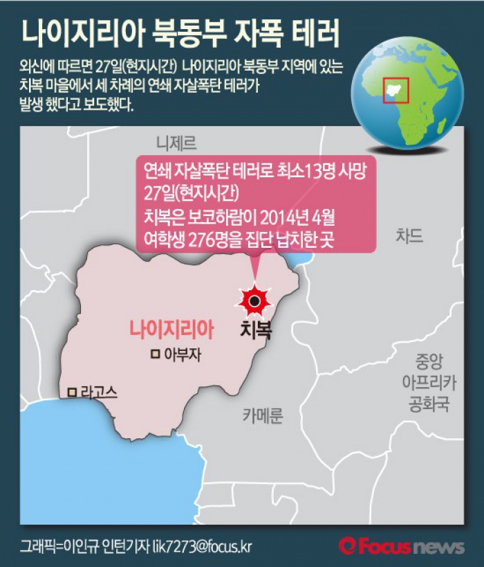 (서울=포커스뉴스) 외신에 따르면 27일(현지시간) 나이지리아 북동부 치복에서 세 차례의 연쇄 자살폭탄 테러가 발생해 13명이 사망했다고 보도했다.