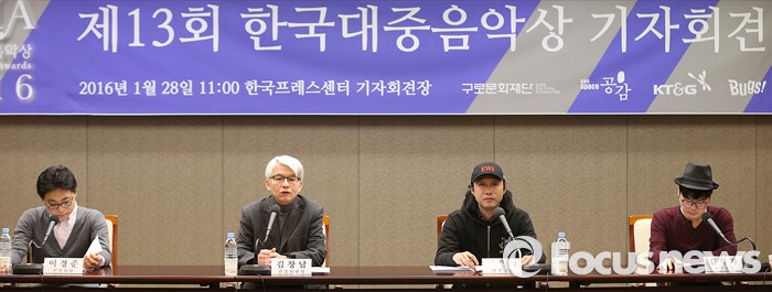 (서울=포커스뉴스) 28일 오전 서울 중구 프레스센터에서 열린 '제13회 한국대중음악상 기자회견' 에 참석한 김창남 선정위원장이 인사말을 하고 있다. 왼쪽부터 선정위원 이경준, 김창남(선정위원장), 박은석, 김작가.