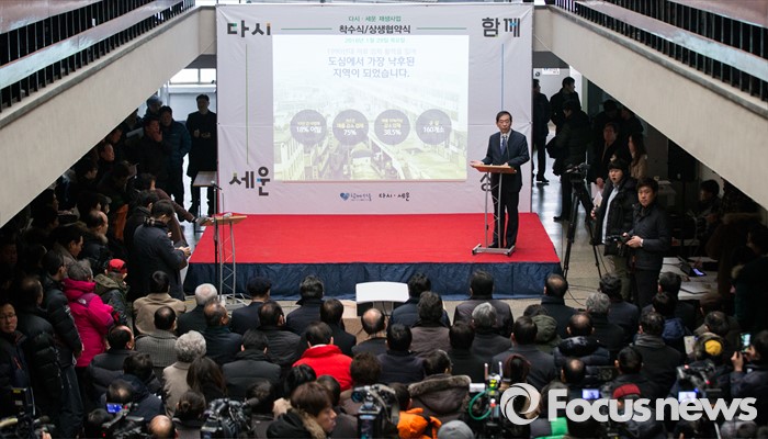 (서울=포커스뉴스)박원순 서울시장이 28일 오전 서울 종로 세운상가에서 열린 세운상가 재생사업 현장 설명회에 참석해 사업 발표를 하고 있다.