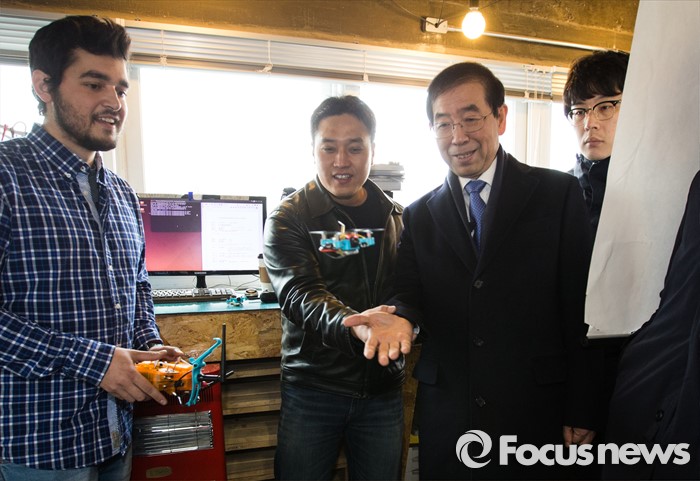 (서울=포커스뉴스) 박원순 서울시장이 28일 오전 서울 종로구 세운상가 디지털 기술 기반 제작 및 교육 공간을 찾아 작업자들이 만든 드론을 살펴보고 있다.