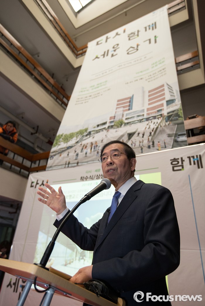 (서울=포커스뉴스) 박원순 서울시장이 28일 오전 서울 종로 세운상가에서 열린 세운상가 재생사업 현장 설명회에 참석해 사업 발표를 하고 있다.