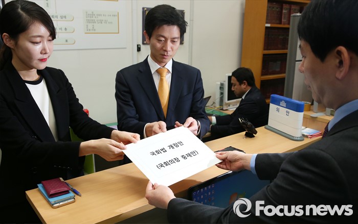 (서울=포커스뉴스) 28일 오후 서울 여의도 국회에서 국회의장실 장우진 정무비서관(오른쪽)과 이민경 부대변인이 정의화 국회의장이 대표발의한 국회법 개정안 중재안을 의안과에 제출하고 있다.