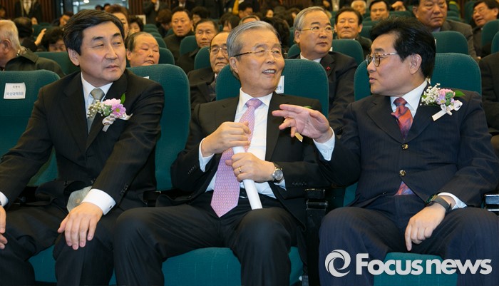 (서울=포커스뉴스) 28일 오후 서울 여의도 국회도서관에서 열린 더불어민주당 60년사 출판기념회에 참석한 김종인(가운데) 비대위원장, 이종걸(왼쪽) 원내대표, 전병헌 창당60주년 기념사업추진위원장이 대화하고 있다.