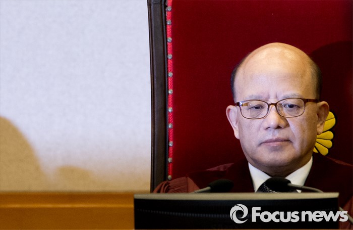 (서울=포커스뉴스) 28일 오후 서울 종로구 헌법재판소 대심판정에서 박한철 헌법재판소장이 국회 선진화법 권한쟁의 공개변론 시작을 기다리고 있다.