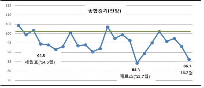 이번 전망치는 지난 2014년 6월 세월호 사고(94.5, 2014년 6월) 때보다 낮고, 지난해 7월 메르스 사태 때와 비슷한 수준이다.