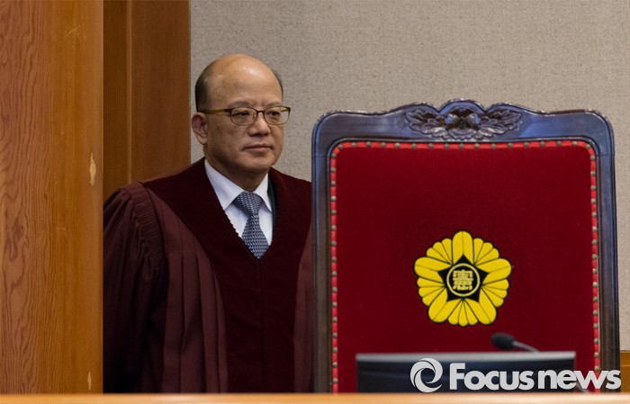 (서울=포커스뉴스) 28일 오후 서울 종로구 헌법재판소 대심판정에서 박한철 헌법재판소장이 국회 선진화법 권한쟁의 공개변론에 참석하기 위해 입장하고 있다.