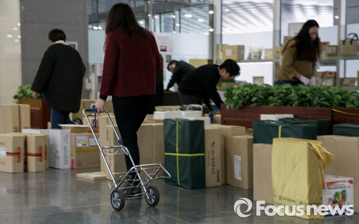 (서울=포커스뉴스) 설을 열흘여 앞둔 28일 오후 서울 여의도 국회 의원회관에 의실로 배달된 택배들이 쌓여 있다.