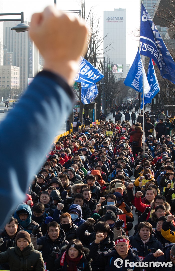 양대노총 공공노조는 "일주일 전 발표된 양대 지침이 아무런 사회적 명분도, 합의도, 정당성도 없었듯이 오늘 결정하려는 공공기관에 대한 지침도 역시 마찬가지"라며 지침 폐기를 요구했다.27일 오후 서울 종로구 세종로 소공원에서 열린 '민주노총 총파업 수도권대회'에 참가한 민주노총 조합원들이 정부의 노동법 개정 중단을 촉구하는 구호를 외치고 있다. 2016.01.27 오장환 기자