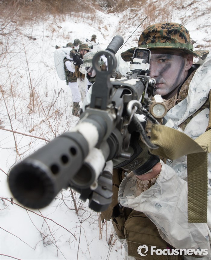 (평창=포커스뉴스) 28일 강원도 평창군 황병산 해병대 산악 종합훈련장에서 열린 '한·미 해병대 연합 동계 설한지 훈련'에 해병대 수색대대와 미 해병대 3사단 수색중대 장병들이 참가하고 있다.