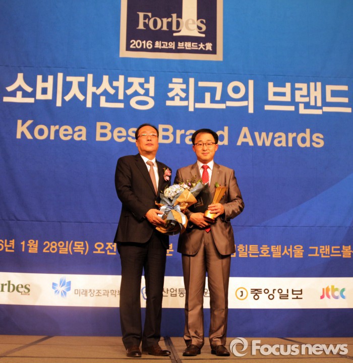 한편 2016 소비자 선정 최고의 브랜드 대상은 포브스코리아가 주최하고 미래창조과학부와 산업통상사원부가 후원한다. 소비자로부터 가치를 인정 받는 상품 및 기업의 브랜드를 평가해 소비자에게 올바른 가이드를 제공하고, 산업 경제 발전과 국가브랜드 경쟁력 향상에 기여하기 위해 제정됐다.28일 열린 서울 힐튼호텔서 열린 '2016 소비자선정 최고의 브랜드 대상' 시상식에서 왼쪽부터 최훈 중앙일보 편집국장, 이범구 형지엘리트 이사가 기념 사진을 찍고 있다. <사진제공=형지엘리트>