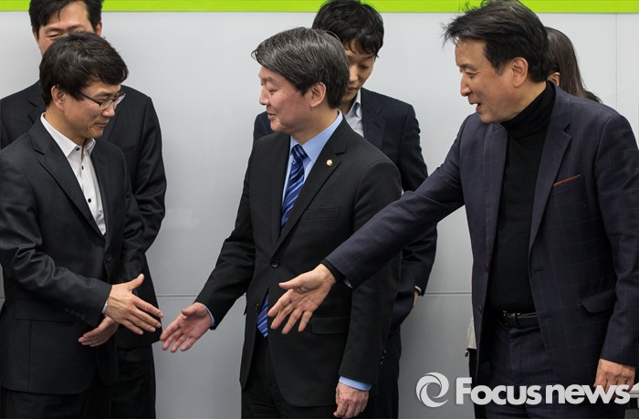 (서울=포커스뉴스) 28일 오후 서울 강남구 창업지원센터에서 열린 '국민의당-핀테크 기업인 간담회'에 참석한 안철수(가운데) 인재영입위원장이 국민의당 정책자문으로 영입된 유철종(왼쪽) 크라우드연구소 대표와 악수하고 있다.