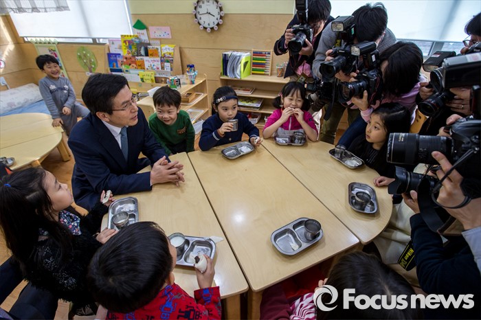 (서울=포커스뉴스) 만3-5세 유아에게 공통적으로 제공하는 교육, 보육 과정인 누리과정 예산 파행으로 보육대란이 이어지고 있는 28일 오후 서울 종로구 한 어린이집을 찾은 황교안 국무총리가 어린이들과 대화를 나누고 있다.
