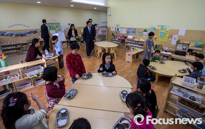 (서울=포커스뉴스) 만3-5세 유아에게 공통적으로 제공하는 교육, 보육 과정인 누리과정 예산 파행으로 보육대란이 이어지고 있는 28일 오후 서울 종로구 한 어린이집을 찾은 황교안 국무총리가 어린이들과 대화를 나누기 위해 교실로 들어서고 있다.