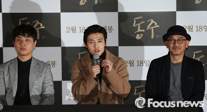 (서울=포커스뉴스) 28일 오후 서울 동대문 메가박스에서 열린 영화 '동주' 언론시사회에 참석한 배우 강하늘이 인사말을 하고 있다. 왼쪽부터 배우 박정민, 강하늘, 영화감독 이준익.
