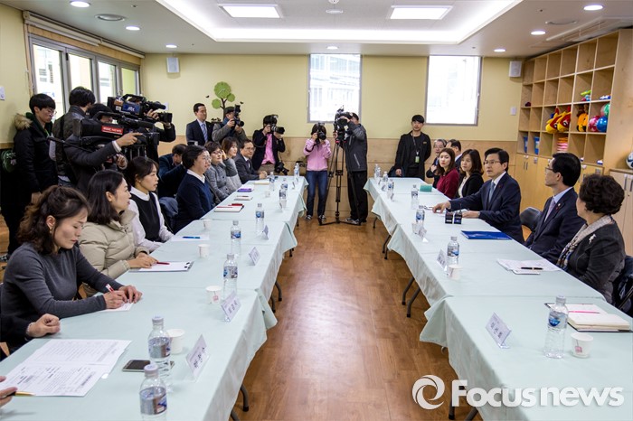 (서울=포커스뉴스) 만3-5세 유아에게 공통적으로 제공하는 교육, 보육 과정인 누리과정 예산 파행으로 보육대란이 이어지고 있는 28일 오후 서울 종로구 한 어린이집을 찾은 황교안 국무총리가 교사들과 간담회에 앞서 인사말을 하고 있다.