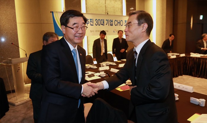 (서울=포커스뉴스) 이기권 고용노동부 장관이 28일 오전 서울 중구 프라자 호텔에서 30대 기업 인사노무담당총괄임원(CHO)들을 만나 간담회에 앞서 인사를 하고 있다. <사진제공=고용노동부>