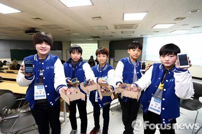 이번 캠프는 오는 30일까지 계속된다. 현대제철은 여름방학에도 이 캠프를 열 계획이다.캠프에 참가한 어린이들이 조립한 로봇을 들고 사진을 찍고 있다. <사진제공=현대제철> 2016.1.28. 김현이 인턴기자