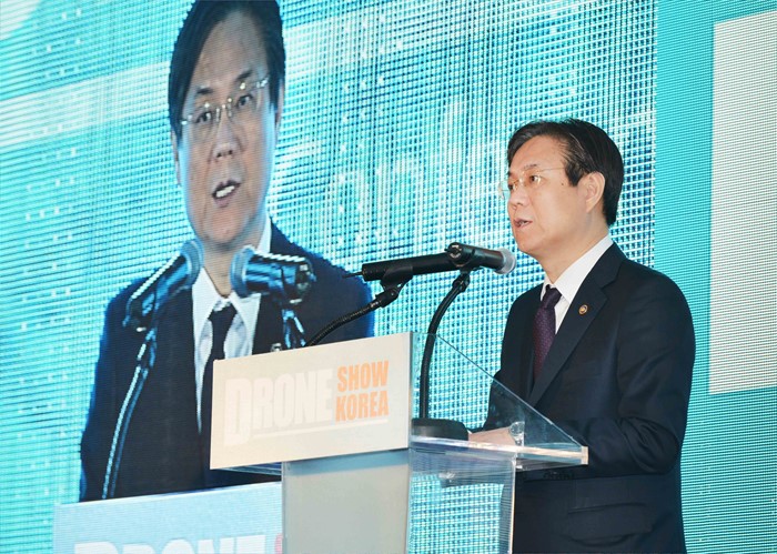 (부산=포커스뉴스) 이관섭 산업통상자원부 1차관이 28일 부산 벡스코에서 열린 2016 드론쇼 코리아(Drone Show Korea 2016)개막식에 참석해 축사를 하고 있다. <사진제공=산업통산자원부>