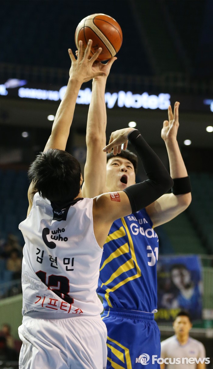 (서울=포커스뉴스) 28일 서울 잠실실내체육관에서 열린 2015-2016 프로농구 삼성-KT 경기에서 KT 김현민이 삼성 김준일의 슈팅을 블록슛하고 있다.