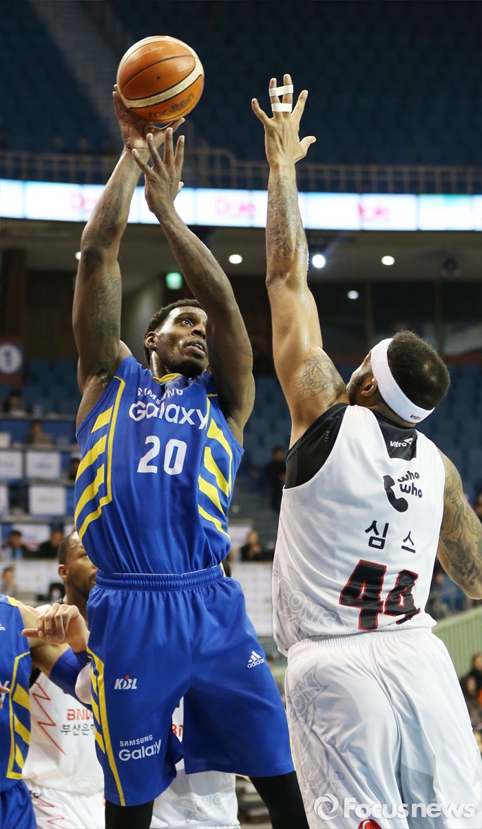 (서울=포커스뉴스) 28일 서울 잠실실내체육관에서 열린 2015-2016 프로농구 삼성-KT 경기에서 삼성 라틀리프가 KT 심스의 마크를 받으며 점프슛을 시도하고 있다.