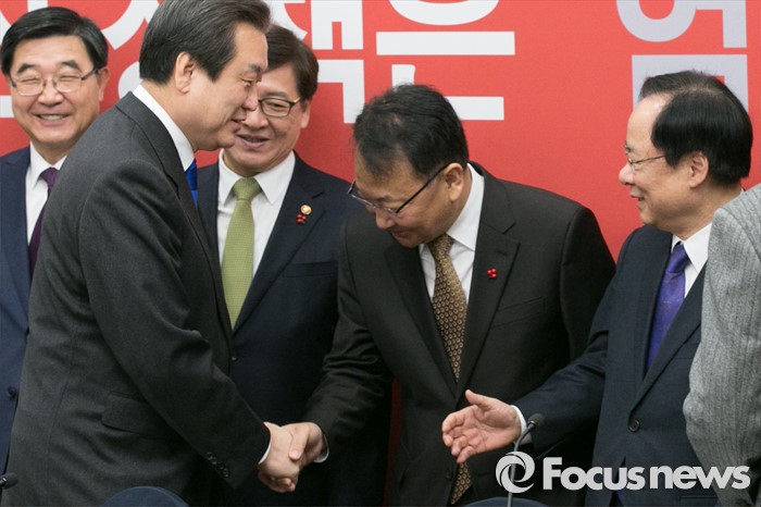 (서울=포커스뉴스) 김무성(앞줄 왼쪽) 새누리당 대표와 유일호(오른쪽 두번째) 경제부총리 겸 기획재정부 장관이 29일 오전 서울 여의도 국회에서 열린 저출산 대책 당정협의에 참석해 악수하고 있다.