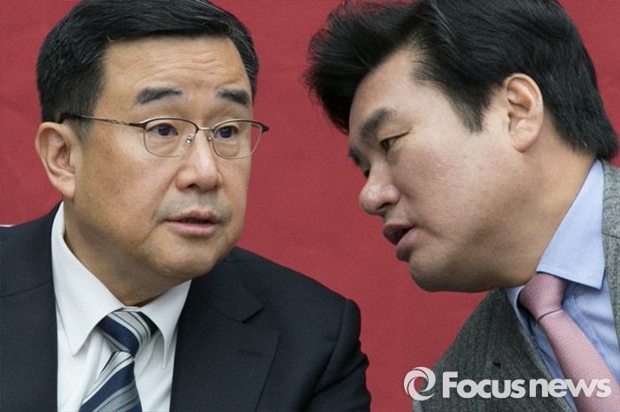 (서울=포커스뉴스) 원유철(오른쪽) 새누리당 원내대표와 김정훈 정책위의장이 29일 오전 서울 여의도 국회에서 열린 원내대책회의에 참석해 대화하고 있다.