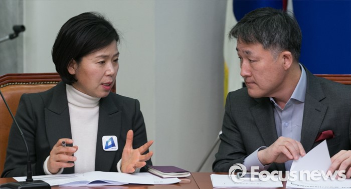 (서울=포커스뉴스) 양향자(왼쪽), 표창원 더불어민주당 선대위원이 29일 오전 서울 여의도 국회에서 열린 중앙선거대책위원회의에 참석해 대화하고 있다.