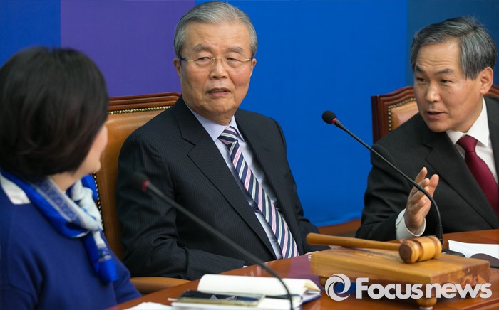 (서울=포커스뉴스) 김종인(가운데) 더불어민주당 선대위원장 겸 비대위원장과 박영선(왼쪽), 우윤근 선대위원이 29일 오전 서울 여의도 국회에서 열린 중앙선거대책위원회의에 참석해 대화하고 있다.