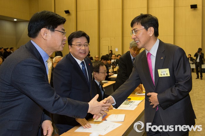 (세종=포커스뉴스) 29일 오전 세종시 정부세종컨벤션센터 국제회의장에서 열린 국가균형발전선언 12주년 기념행사에서 안희정(오른쪽) 충남지사가 이춘희 세종시장과 악수하고 있다. 가운데는 권선택 대전시장.