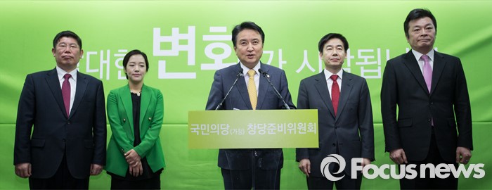 (서울=포커스뉴스) 국민의당 한상진 공동창당준비위원장과 김영환 의원이 29일 서울 마포구 국민의당 당사에서 열린 방송 정치평론가 4인 입당 기자회견에서 포즈를 취하고 있다. 왼쪽부터 김경진 변호사, 강연재 변호사, 김영환 의원, 이용호 정치평론가, 김철근 동국대 겸임교수.
