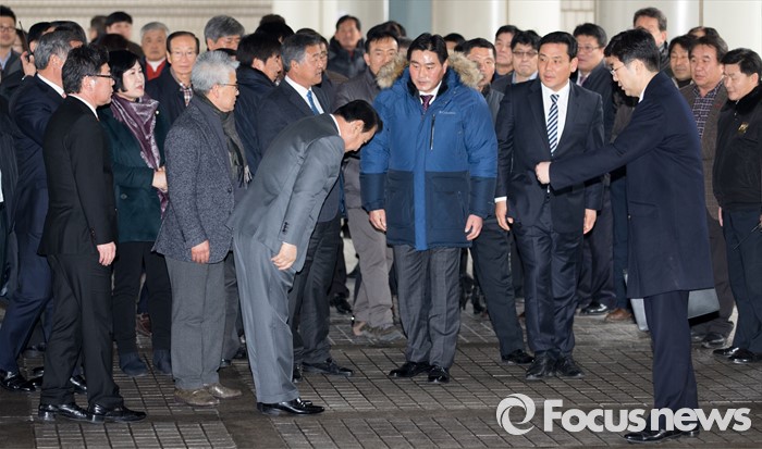 (서울=포커스뉴스) 고 성완종 전 경남기업 회장에게 불법 정치자금 3000만원을 받은 혐의로 기소된 이완구 전 국무총리가 29일 오후 1심 선고공판에 출석하기 위해 서울중앙지방법원으로 들어서며 지지자들에게 인사를 하고 있다.