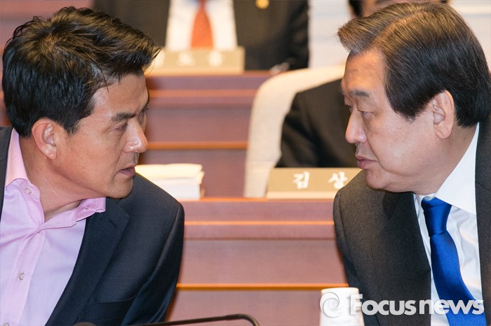 (서울=포커스뉴스) 김무성(오른쪽) 새누리당 대표와 김태호 최고위원이 29일 오후 서울 여의도 국회에서 열린 의원총회에 참석해 대화하고 있다.