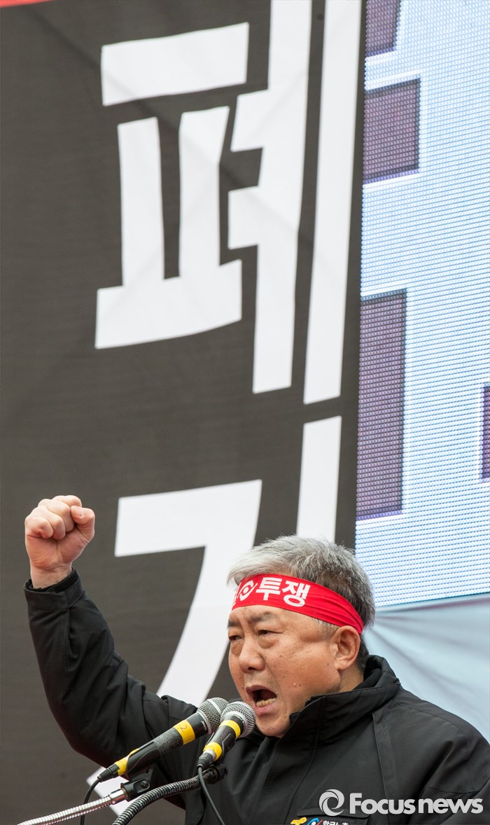 (서울=포커스뉴스) 29일 오후 서울역 광장에서 열린 '한국노총 전국 단위노조 대표자 총력투쟁 결의대회'에 참석한 김동만 위원장이 정부가 발표한 양대 행정지침 폐기를 촉구하는 구호를 외치고 있다.