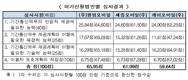 심사결과 퀀텀모바일은 총점 65.95점, 세종모바일은 총점 61.99점, 케이모바일은 총점 59.64점을 획득하여 모두 허가적격 기준에 미달했다.