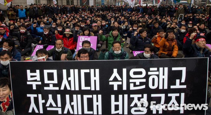 (서울=포커스뉴스) 29일 오후 서울역 광장에서 열린 '한국노총 전국 단위노조 대표자 총력투쟁 결의대회'에 참석한 조합원들이 정부가 발표한 양대 행정지침 폐기를 촉구하는 구호를 외치고 있다.