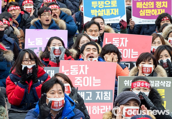 (서울=포커스뉴스) 29일 오후 서울역 광장에서 열린 '한국노총 전국 단위노조 대표자 총력투쟁 결의대회'에 참석한 조합원들이 함성을 외치고 있다.