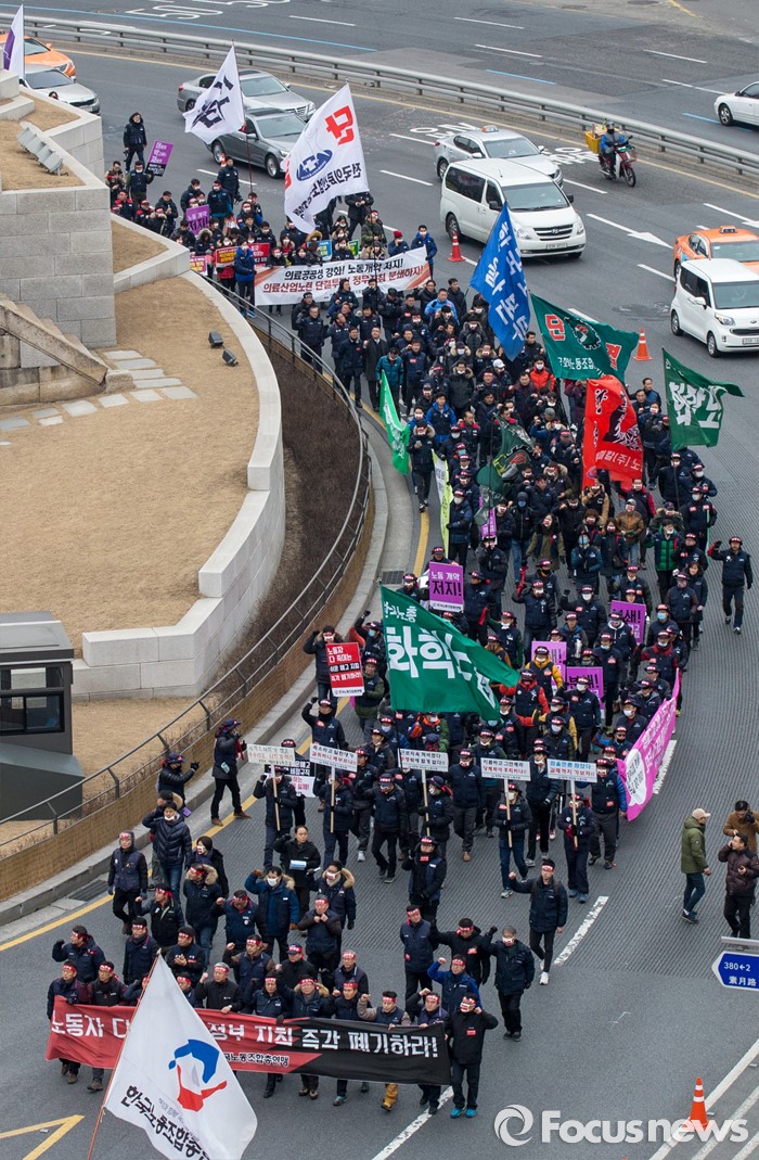 (서울=포커스뉴스) 29일 오후 서울역 광장에서 열린 '한국노총 전국 단위노조 대표자 총력투쟁 결의대회'에 참석한 조합원들이 서울광장을 향해 행진하고 있다.