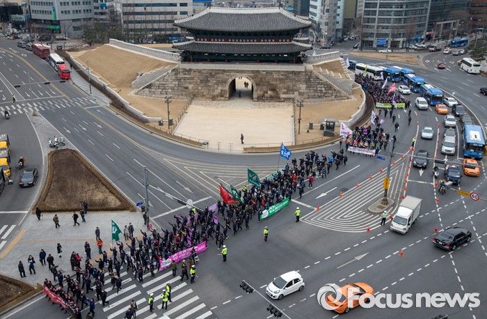 (서울=포커스뉴스) 29일 오후 서울역 광장에서 열린 '한국노총 전국 단위노조 대표자 총력투쟁 결의대회'에 참석한 조합원들이 서울광장을 향해 행진하고 있다.