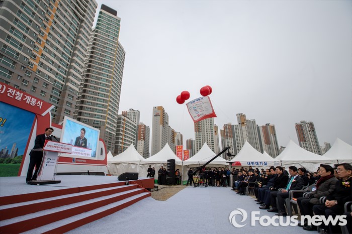 (수원=포커스뉴스) 강호인 국토교통부 장관이 29일 오후 경기도 수원시 영통구 신분당선 광교중앙역에서 열린 '정자-광교 복선전철 개통행사'에 자리해 치사 하고 있다.