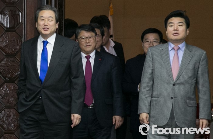 (서울=포커스뉴스) 김무성(왼쪽부터) 새누리당 대표, 조원진 원내수석부대표, 원유철 원내대표가 29일 오후 서울 여의도 국회에서 의원총회를 마친 뒤 나서고 있다.