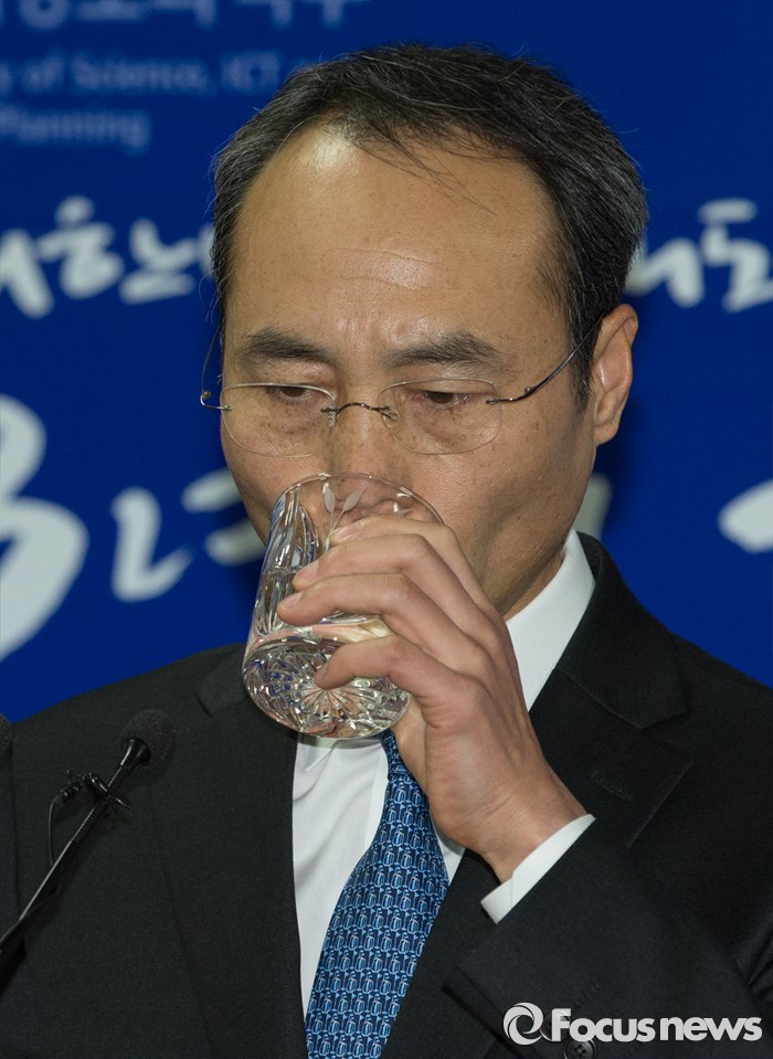 (과천=포커스뉴스) 29일 오후 경기 정부과천청사 미래창조과학부에서 조규조 통신정책국 국장이 제4이동통신 심사 결과 발표를 마치고 취재진의 질문에 답변하던 중 물을 마시고 있다.