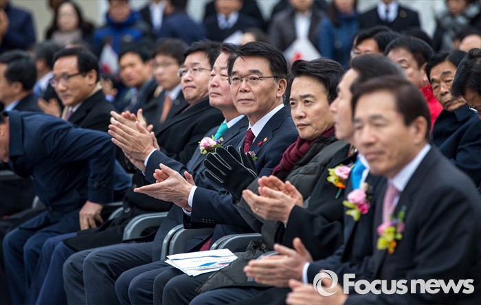 (수원=포커스뉴스) 강호인(오른쪽 네 번째) 국토교통부 장관을 비롯한 주요내빈들이 29일 오후 경기도 수원시 영통구 신분당선 광교중앙역에서 열린 '정자-광교 복선전철 개통행사'에 자리해 사업 경과보고를 청취한 뒤 박수 치고 있다.