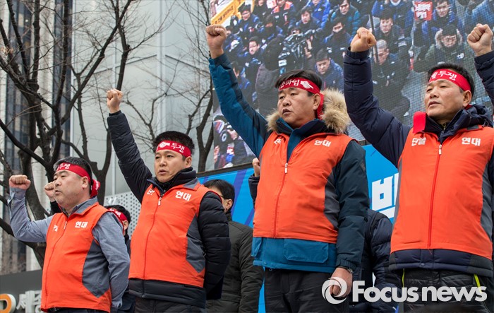 (서울=포커스뉴스) 29일 오후 서울 종로구 정부서울청사 앞에서 열린 '2대지침 폐기, 양대노총 공동투쟁 및 불복종 투쟁 선포식'에 참석한 양대노조 제조공투본 위원장들이 투쟁선언문 낭독 후 구호를 외치고 있다. 앞줄 왼쪽부터 김동명 한국노총 화학노련 위원장, 김상구 민주노총 금속노조 위원장, 김만재 한국노총 금속노련 위원장, 신환섭 민주노총 화섬연맹 위원장.