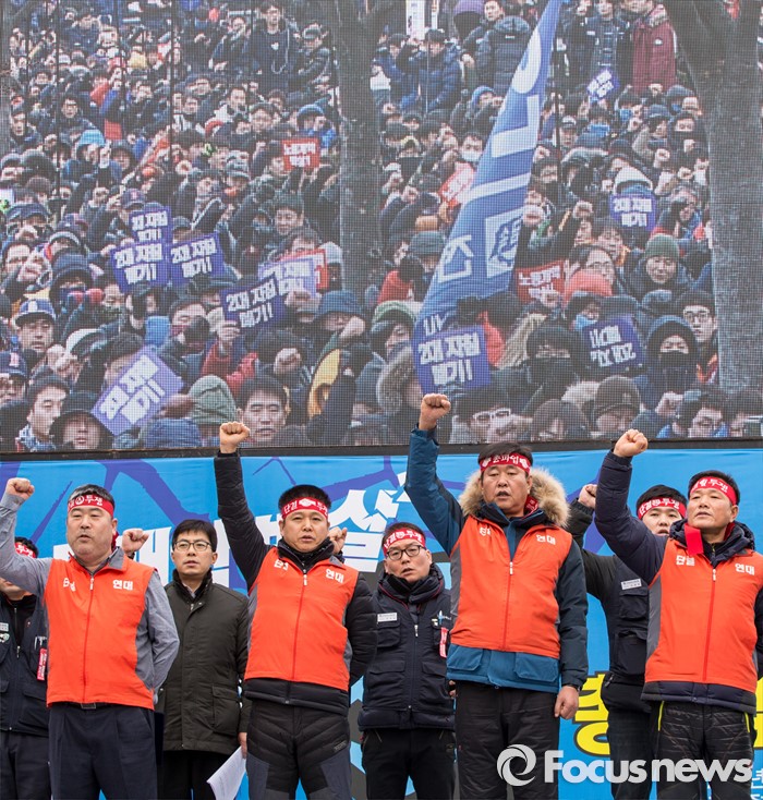 (서울=포커스뉴스) 29일 오후 서울 종로구 정부서울청사 앞에서 열린 '2대지침 폐기, 양대노총 공동투쟁 및 불복종 투쟁 선포식'에 참석한 양대노조 제조공투본 위원장들이 투쟁선언문 낭독 후 구호를 외치고 있다. 앞줄 왼쪽부터 김동명 한국노총 화학노련 위원장, 김상구 민주노총 금속노조 위원장, 김만재 한국노총 금속노련 위원장, 신환섭 민주노총 화섬연맹 위원장.