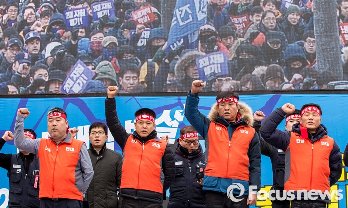 (서울=포커스뉴스) 29일 오후 서울 종로구 정부서울청사 앞에서 열린 '2대지침 폐기, 양대노총 공동투쟁 및 불복종 투쟁 선포식'에 참석한 양대노조 제조공투본 위원장들이 투쟁선언문 낭독 후 구호를 외치고 있다. 앞줄 왼쪽부터 김동명 한국노총 화학노련 위원장, 김상구 민주노총 금속노조 위원장, 김만재 한국노총 금속노련 위원장, 신환섭 민주노총 화섬연맹 위원장.