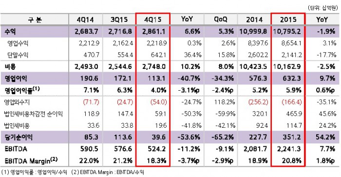 그러나 지난해 4분기 성적표는 좋지 못했다. 지난해 4분기 영업이익은 전년 동기보다 40%하락한 1131억원을 기록했다. 같은 기간 매출은 2조8611억원으로 전년 동기보다 6.6% 늘었지만, 당기순이익은 전년 같은 기간보다 53.6% 줄어든 396억원을 기록했다.