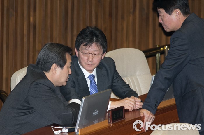 (서울=포커스뉴스) 29일 오후 서울 여의도 국회에서 예정된 338회 국회(임시회) 4차 본회의에 참석한 김무성(왼쪽부터) 새누리당 대표, 유승민, 한선교 의원이 대화하고 있다.