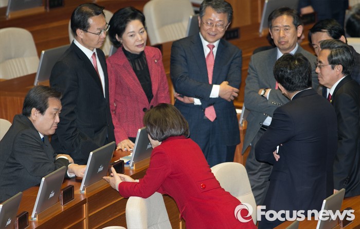 (서울=포커스뉴스) 29일 오후 서울 여의도 국회에서 예정된 338회 국회(임시회) 4차 본회의에 참석한 김무성(왼쪽 첫번째) 새누리당 대표와 의원들이 대화하고 있다.