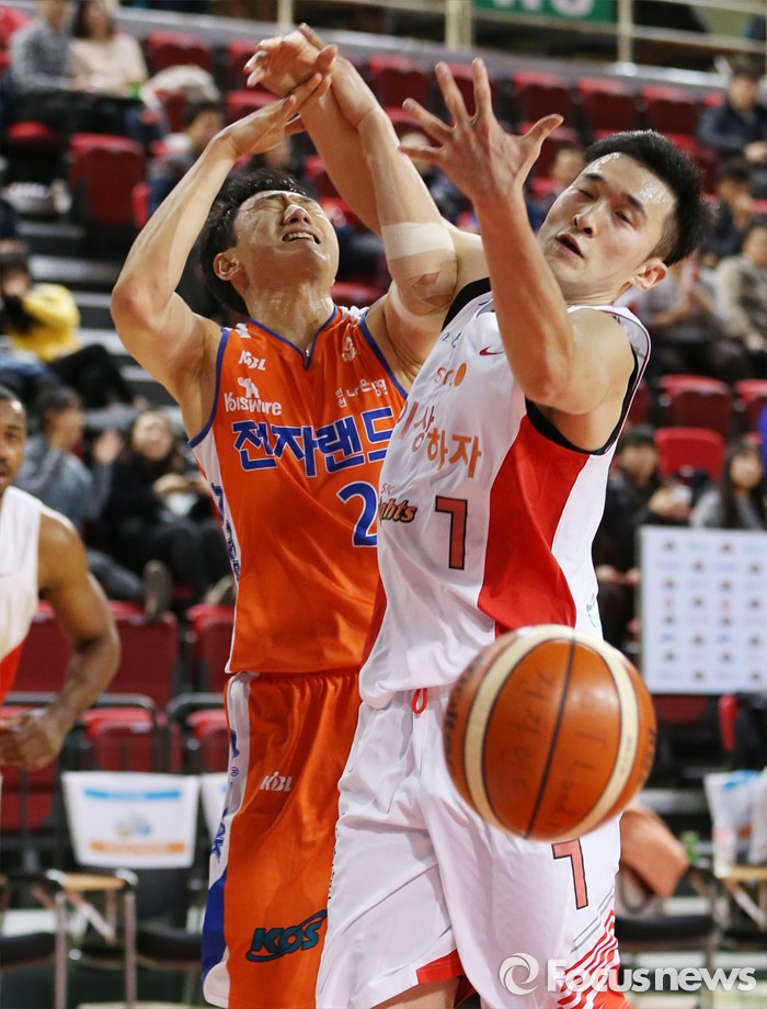 (인천=포커스뉴스) 29일 인천 삼산체육관에서 열린 2015-2016 프로농구 전자랜드-SK 경기에서 전자랜드 정영삼이 골밑 돌파를 시도하다 SK 변기훈의 수비에 막히며 볼을 놓치고 있다.